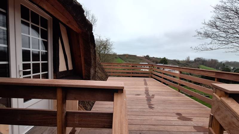 La société FBBC – Frédéric Barbosa Bois et Construction – est intervenue à Fécamp pour la réalisation complète d’une terrasse sur pilotis en bois exotique cumaru, accompagnée d’un escalier extérieur et de garde-corps. Ce projet de construction bois avait pour objectif de créer un espace extérieur durable, esthétique et parfaitement intégré à l’habitation.